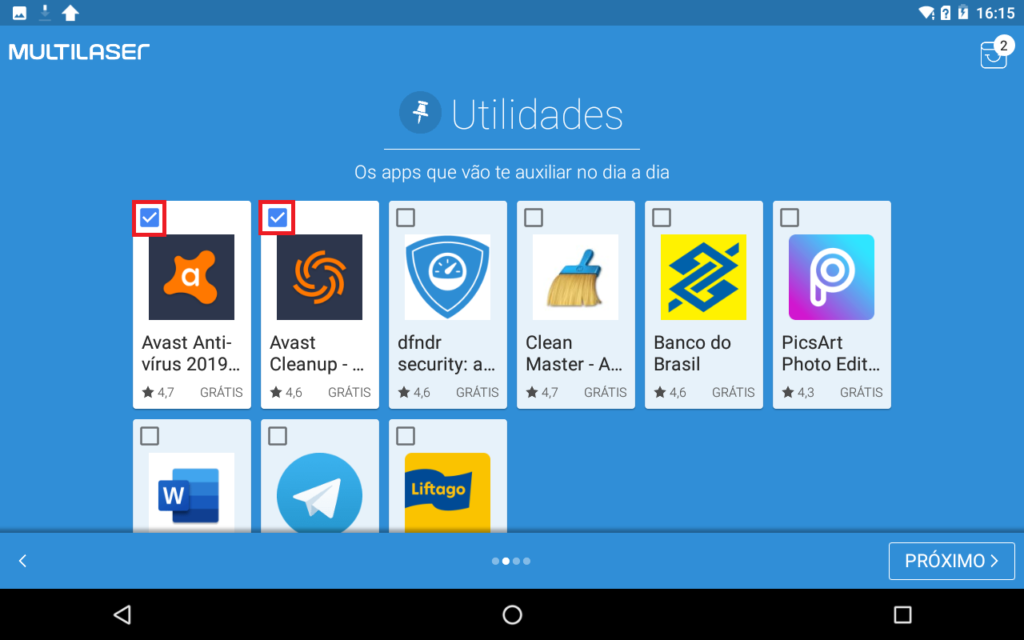 11 - Agora na próxima tela toque no botão "continuar". Note que o tablet te indicara vários aplicativos para baixa-los, o que você deve fazer nesse momento é desabilitar todos aplicativos que estiverem selecionados, para fazer isso basta tocar em cima da "Flechinha azul". Faça isso nas 4 paginas de aplicativos, para acessar as demais é necessário rolar a tela para o lado esquerdo, feito isso desabilite todos que estiverem selecionados tocando na "Flechinha azul". Depois de desabilitar todos programas que estavam selecionados toque no botão "Concluir".